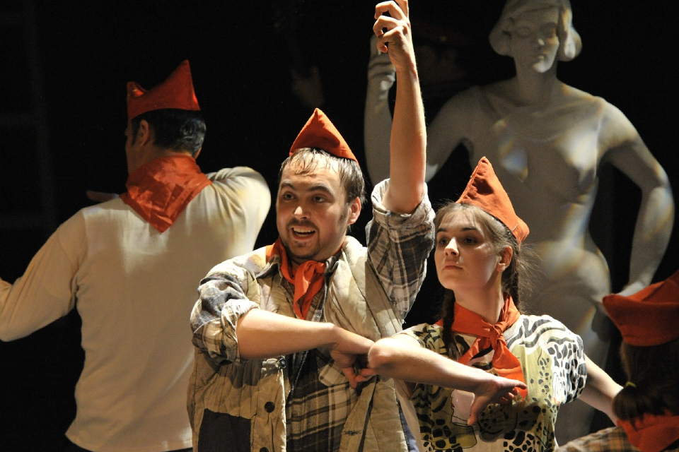 Особенностью постановки стало и то, что здесь сломана привычная структура «зал-сцена» — создатели спектакля поставили на вращающийся поворотный круг амфитеатр для зрителей. Это как обзорное колесо, вокруг которого вьется лента времени и пространства: от общежития до Вторчермета, от Парка культуры и отдыха имени Маяковского на крышу. И каждая из «станций» несет в себе приметы Екатеринбурга/Свердловска рубежа 80-х—90-х, тех баснословных лет, когда «так хорошо мы плохо жили». Соединение узнаваемых деталей советского быта с фантасмагорическими картинами создает особенную атмосферу этого театрального «маршрута».