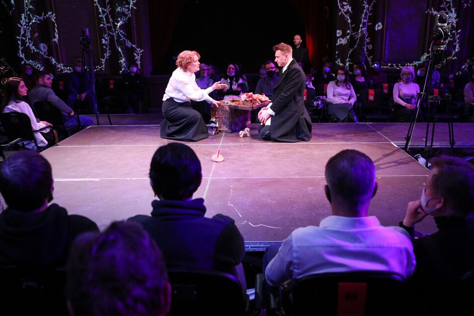 В спектакле сошлись воедино звук, цвет и свет. Эффект сценографии постановки усиливается благодаря «отзеркаливанию» лиц актеров и живыми проекциями, стилизованными под старину, которые смотрят на зрителя из многочисленных зеркал бывшего ресторана Эрмитаж. Все эти современные визуальные эффекты органично вошли в сценографию, созданную Лилией Хисматуллиной. Таким образом, зал Эрмитаж становится важным героем постановки.