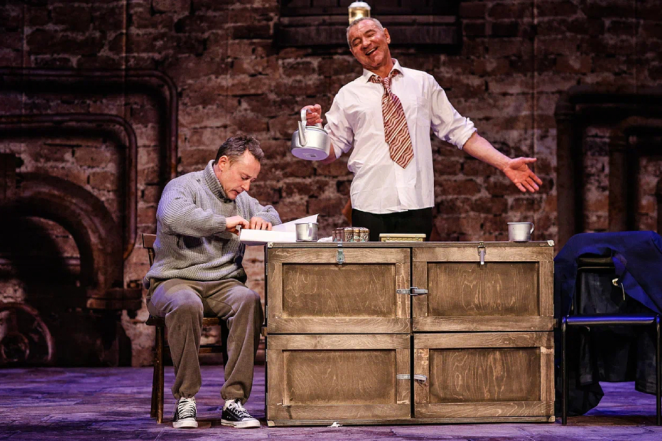 В постановке заняты два актера, очень разные по фактуре, бэкграунду и амплуа. Это — один из самых брутальных артистов Максим Дрозд и один из самых интеллигентных — Дмитрий Исаев. Играют они, соответственно, Работягу и Интеллигента (распределение ролей, думается, понятно).