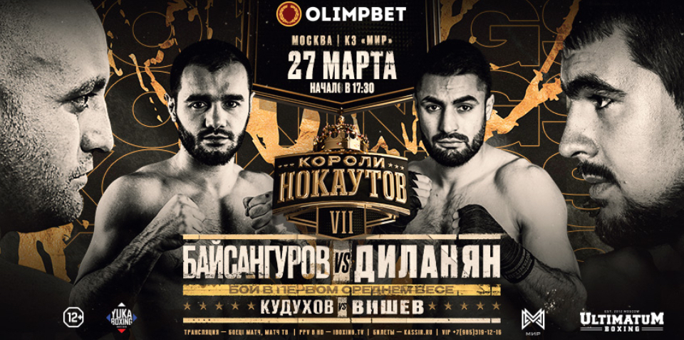 В общей сложности на турнире «Короли Нокаутов» болельщики увидят девять боев. Главное событие вечера – возвращение на ринг экс-обладателя континентальных титулов по версии WBO и IBF, техничного полусредневеса Хусейна Байсангурова 19(17)-1-0. С «бриллиантом из Грозного», как называют спортсмена, сразится представитель Армении Манук Диланян 12(5)-7-2. Его кандидатуру выбрала старейшая промоуторская компания ЮКА.