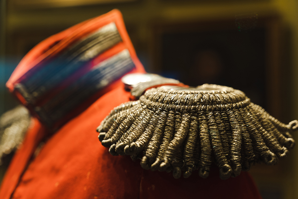 Рядом можно увидеть чекмень его внука флигель-адьютанта Свиты Императора Александра Второго войскового старшины графа Петра Михайловича Орлова-Денисова, в которым 26 января 1881 года он был смертельно ранен ядром при штурме Геол-Тепе (сегодня Туркмения). Подкладка формы сохранила кровь 28-летнего казака.