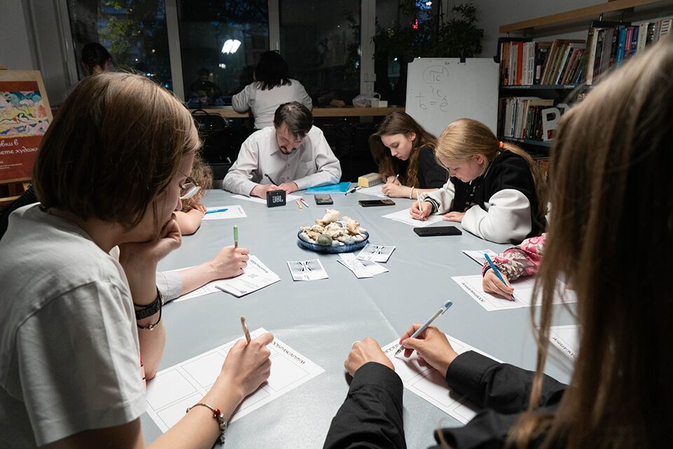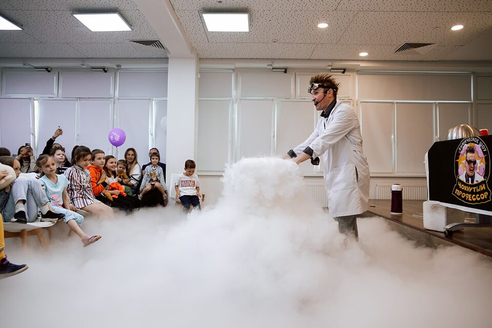 Площадку разделили на импровизированные «стеллажи» — так обозначили зоны разных активностей. Меж ними можно бродить весь вечер. В одной — приключенческий квест, рядышком игротека, по соседству — разыгрывают спектакли в масках. Показывают научное шоу, крутят кино и выставку работ искусственного интеллекта.