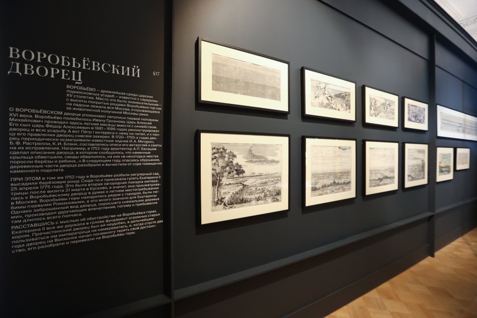 Основная часть выставки рассматривает неожиданную ситуацию, сложившуюся в Москве к 1770-м годам: несмотря на наличие старых императорских дворцов, Екатерина II не могла остановиться ни в одном из них из-за их обветшалости или недостроенности. Великолепные сады оставались единственным свидетельством былого величия. По чертежам из Музея архитектуры на выставке воссоздана беседка из легендарного Головинского сада. Каждому дворцу и саду эпохи барокко посвящена отдельная часть экспозиции.