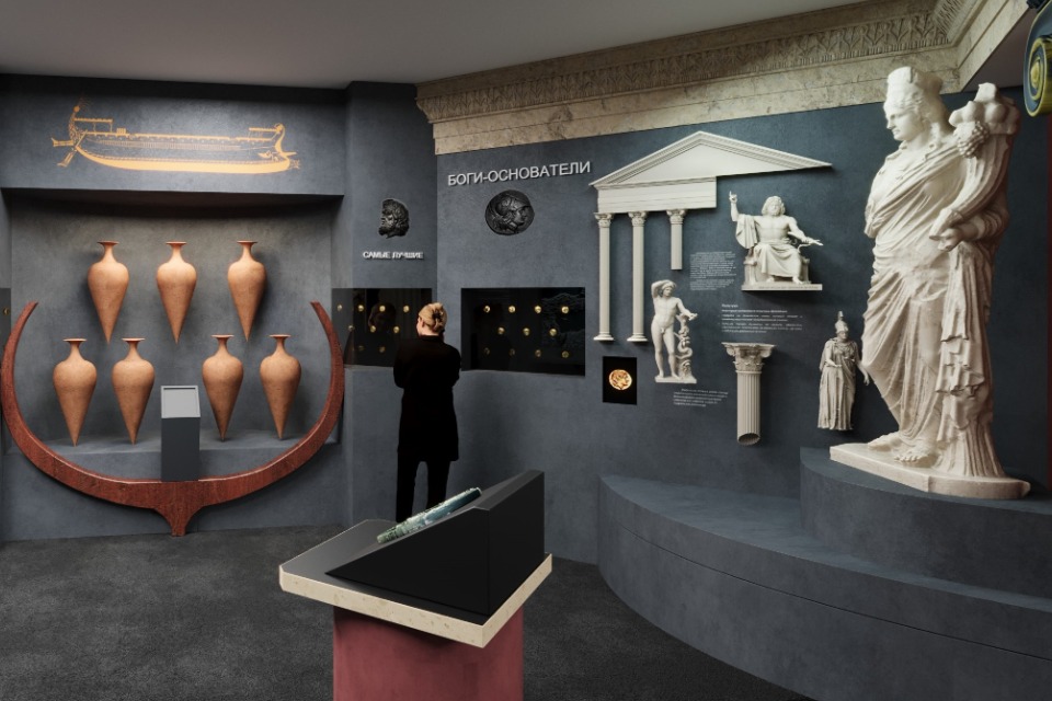 Особое внимание уделено визуальной стороне выставки. Художник Петр Бирюков создал оформление, вдохновленное древнегреческой архитектурой. Центральное место занимает реконструкция античного храма, а элементы крупных скульптур и мелкой пластики выполнены с использованием современных 3D-технологий. Яркие цвета, свет и объем помогают погрузиться в атмосферу древнего мира, не отвлекая от главного — самих экспонатов.