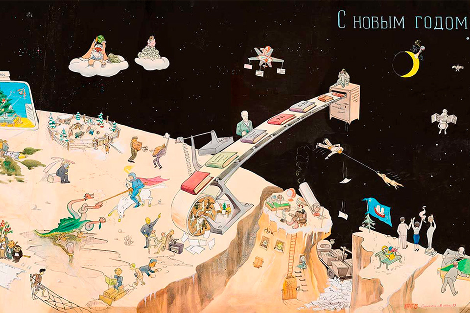 Стенгазеты отражают не только технические проекты — корабли «Восток» и «Восход», ракеты Н-1 и «Протон», лунный посадочный модуль и орбитальные станции — но и личные моменты коллектива, его юмор, наблюдения и иронию. Елка, главный символ праздника, превращалась в сверхтяжелую ракету, дорогу к орбитальной станции или упаковочный парашют для завершения программы. Ракеты и корабли нередко оживали, женились, катались на конях или становились главными героями сюжетов.