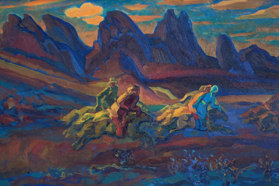 Этот масштабный, с огромным творческим потенциалом и высоким уровнем мастерства представленных авторов, выставочный проект являет миру все разнообразие художественных мотивов и жанров: от портретов ярких типажей коренных народов до неповторимых пейзажей. В «Скачущих всадниках в Умэнгови» Дашинима Дугаров сочетает сложные цветовые отношения с локальными пятнами, почти не используя белил. Так достигается эффект свечения красок изнутри. В этом цветовом вихре стремительно, во весь опор мчатся наездники, буквально врываясь в выставочное пространство. Бурятия – рядом.