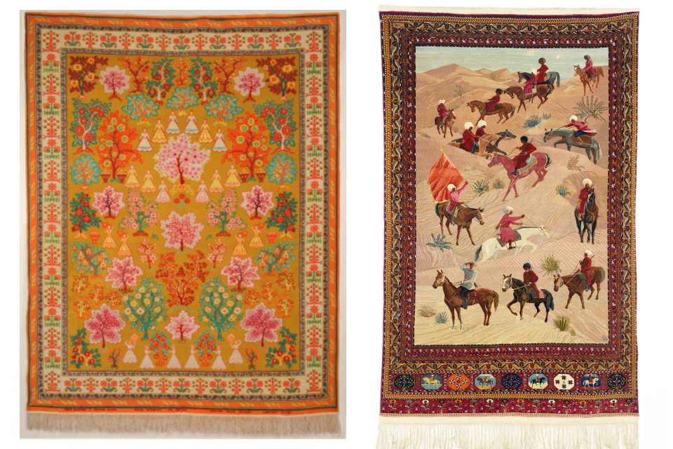 Стоит отметить несколько работ, среди которых «Рог изобилия», сотканный курскими мастерицами специально для выставки в Нью-Йорке, которая проходила в 1939 году. Также в залах представят туркменский ковер «Конный пробег», его создали в 1937, а сюжет на нем посвящен переходу туркменских лошадей по маршруту Ашхабад – Москва. Завораживающий омский ковер-карту «Иртыш» датирован 1959 годом, он говорит об освоении Сибири.