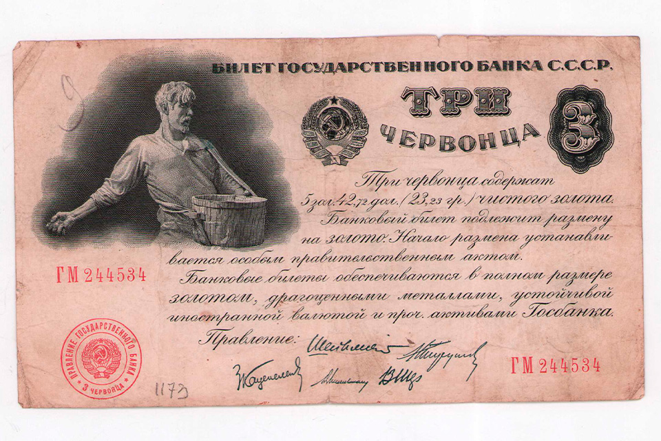 Вторая часть экспозиции посвящена советскому периоду 1920–1930-х годов. Здесь рассказывается о первой советской денежной реформе 1922–1924 годов, введении червонцев, государственной валютной политике и работе магазина Торгсин — уникальной торговой системы, где товары продавались за валюту и драгоценности. Именно сцены с Торгсином вдохновили музей на создание отдельного тематического блока, где представлены товарные ордера — редкие государственные платежные документы эпохи.