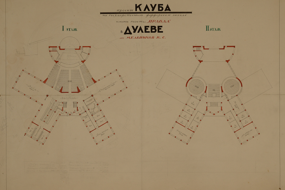 На первом этаже клуба состоится показ материалов о клубах, включая клуб им. Русакова, Буревестник, Каучук, клуб фабрики Свобода, клуб им. Фрунзе и клуб фарфоровой фабрики в Дулёво, а также представление четырех московских гаражей: автобусного гаража на Бахметьевской, гаражей для грузовых машин на Новорязанской улице, и гаража Госплана и Интуриста. В том же пространстве пройдет выставка конкурсных, нереализованных работ Мельникова на главной лестнице. Одни проекты, хоть и не осуществленные, демонстрируют визионерство архитектора и его чисто творческий подход к архитектуре.
