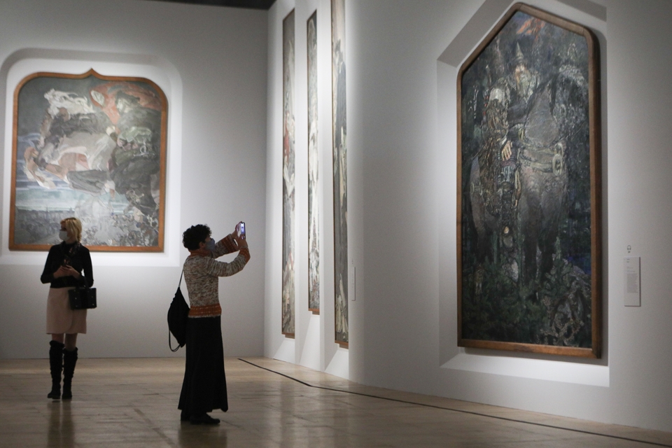 Государственный Русский музей (Санкт-Петербург) привез в Москву самое значительное количество картин – свыше сотни шедевров из постоянной экспозиции и из фондов. Именно там хранятся «Гамлет и Офелия» (1884), «Богатырь» (1898), «Летящий демон» (1899) и «Шестикрылый серафим» (1904), а также редко выставляемые графические произведения.