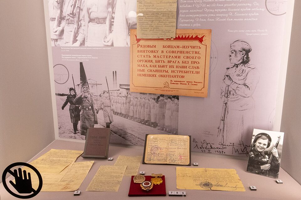 В экспозицию также вошли нагрудные знаки, фотоснимки военных лет, фронтовые письма. В мультимедийной тач-панели посетители смогут посмотреть оцифрованные материалы и подробнее ознакомиться с историей Центральной женской школы снайперской подготовки.