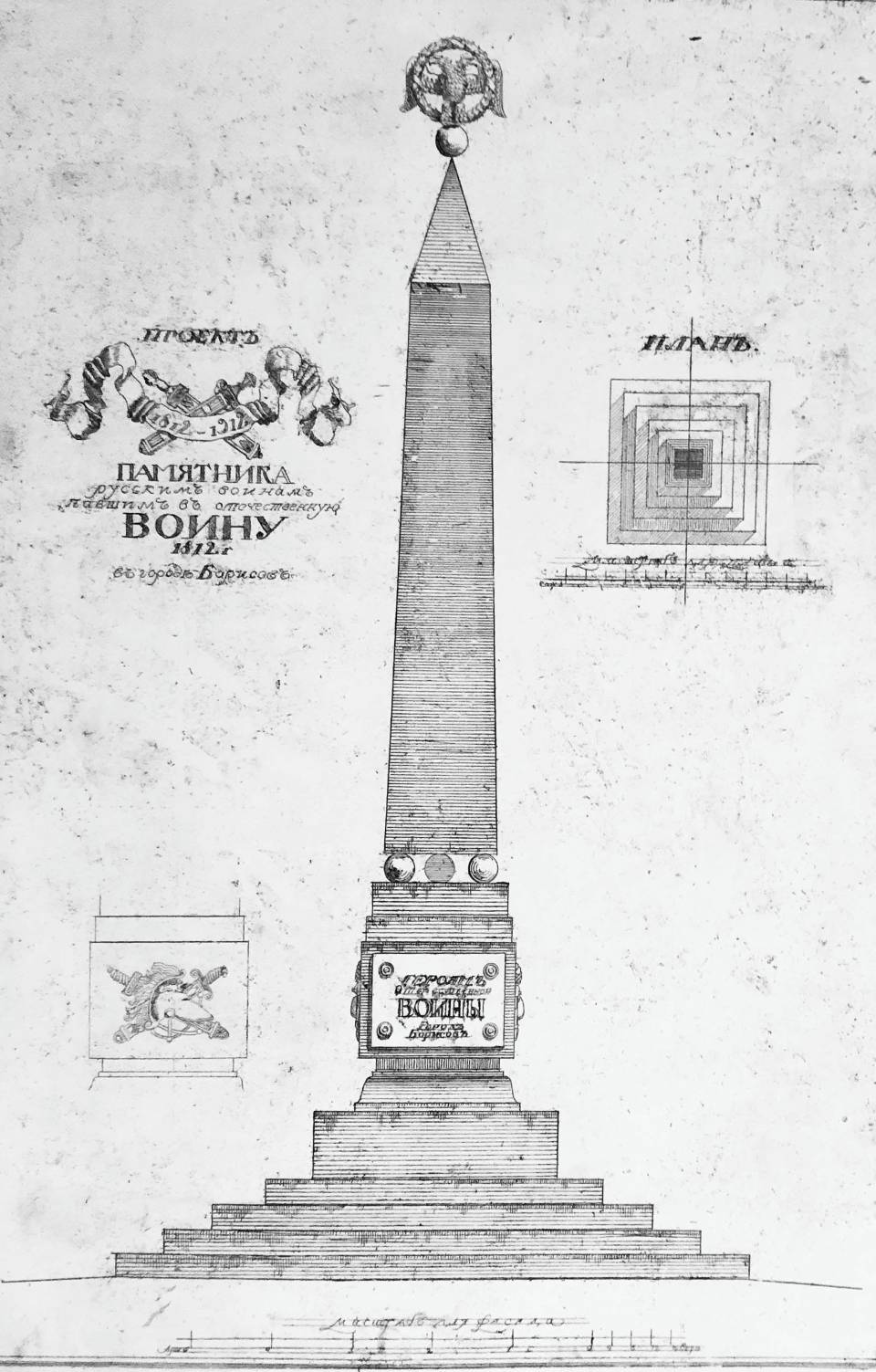 В офортах Фомин также разрабатывал приемы, ракурсы, детали, которые позже появились на его чертежах. Это, например, разнообразные маски – неотъемлемый атрибут архитектуры эпохи неоклассицизма. Особого внимания заслуживают работы, выполненные к 100-летию Отечественной войны 1812 года: конкурсный проект Музея 1812 года и памятники русским воинам – обелиски в Витебске и Борисове.