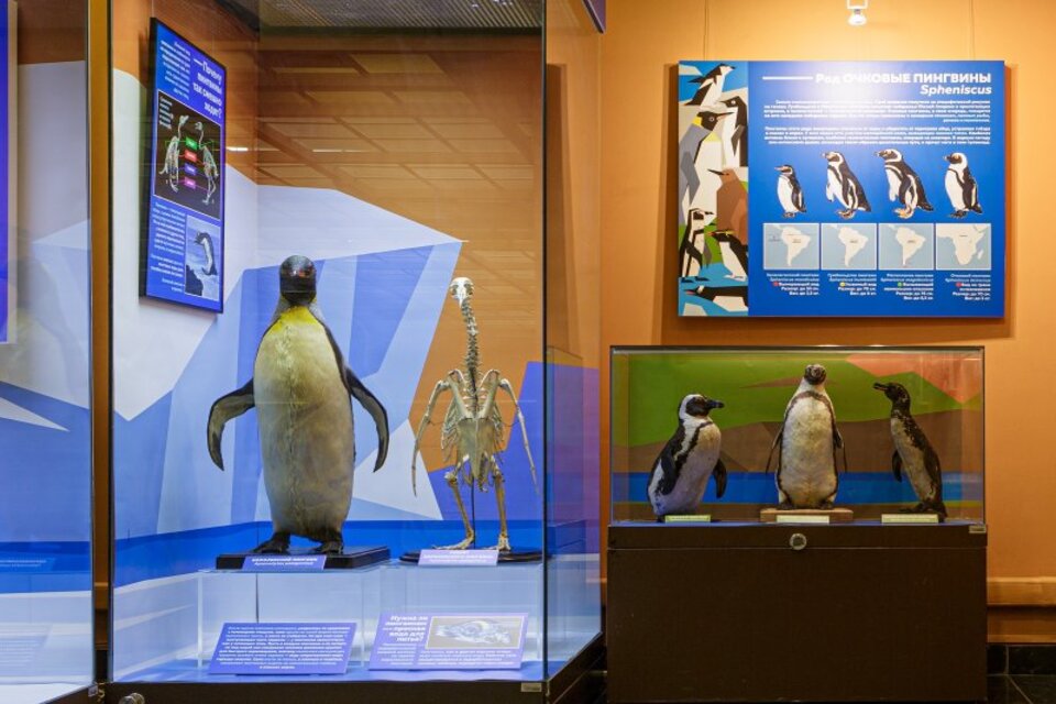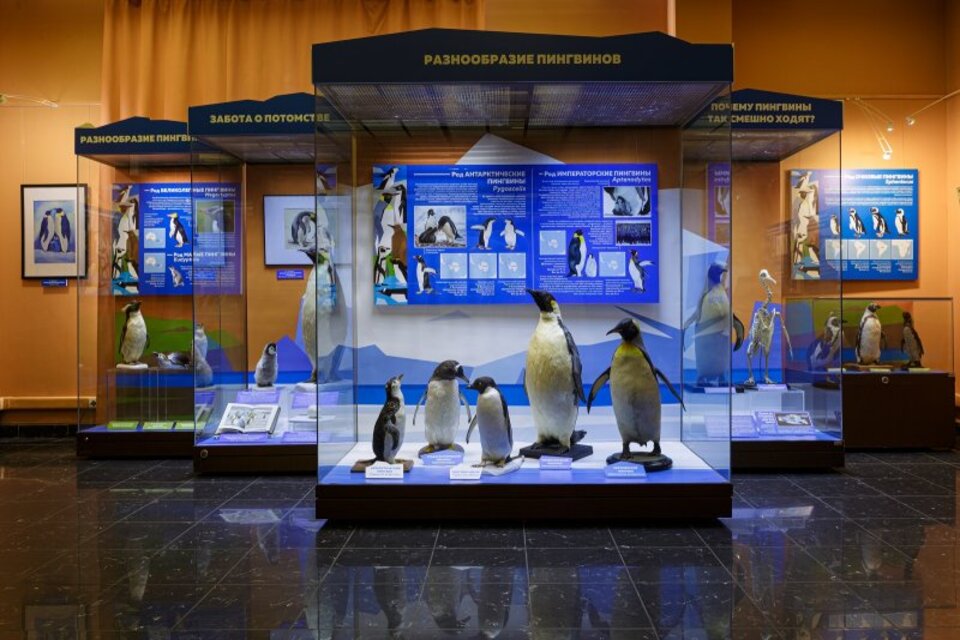 Особое внимание уделено эволюции вида: гости увидят реконструкции доисторических гигантов, таких как Kumimanu fordycei — пингвин ростом с человека, и проследят путь от тропических предков до нынешних обитателей ледяного царства. Экспозиция дополнена уникальными чучелами всех современных видов, скелетом королевского пингвина, графикой классиков анималистики и редкими книгами XVII–XIX веков. Атмосферу шумных «пингвиньих базаров» создадут аудиозаписи реальных голосов птиц из фонотеки музея.