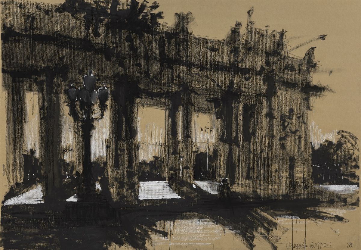 Главная особенность этих работ в том, что они написаны по картону с помощью только одного угля. Масштабная архитектурная конструкция объединяет все картины в единую инсталляцию, благодаря чему они становятся похожи на выхваченные из фотопленки кадры.