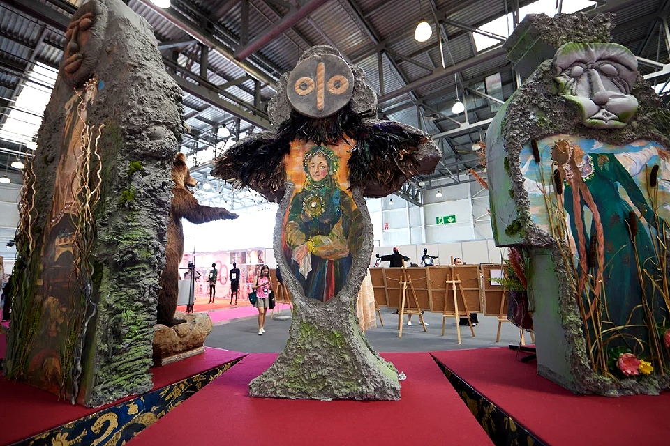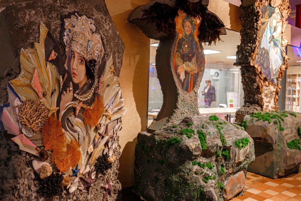 Сециально для проекта все репродукции художник выполнил на объемных тотемах из природных материалов. Фигуры выше человеческого роста, обретающие то форму совы, то форму лесовичка, украшены берестой и мхами, речными ракушками и нарядными бусинами.