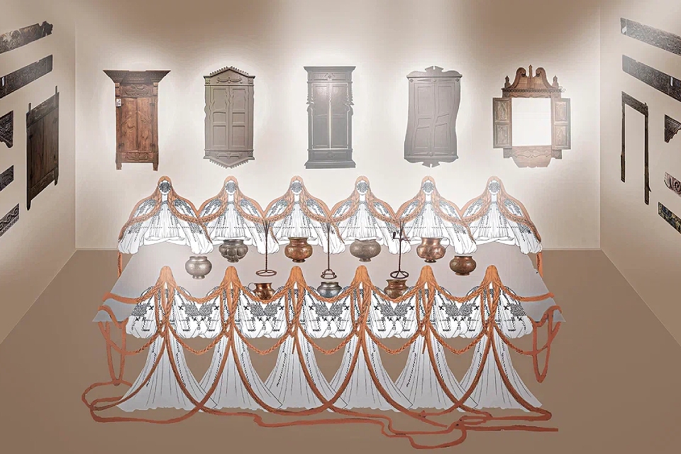 Экспозиция объединяет произведения прикладного искусства из коллекции Государственного исторического музея: резные наличники, кованые сундуки, старинные орудия труда, расписные изразцы, кокошники и металлическую утварь.
