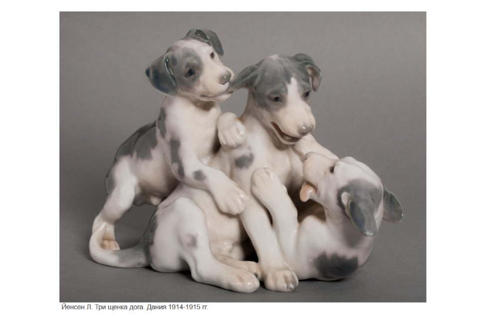 Особое внимание уделено работам Йенса Петера Даль-Йенсена (1874–1960) — одного из главных мастеров анималистического фарфора XX века. Его произведения легко узнать по динамике, живым позам и выразительным образам: например, задумчивый бульдог, играющие щенки или застывшая в ожидании фараонова собака. В экспозиции также представлены работы ведущих художников Королевской мануфактуры и фабрики «Бинг и Грёндаль».