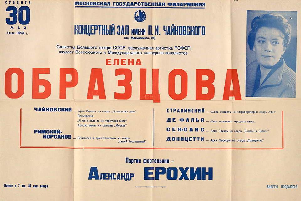 Первый зал посвящён наследию Елены Образцовой. Здесь представлены архивные фотографии, афиши и аудиозаписи её голоса. Материалы экспонируются впервые, а художественное оформление в виде золотых облаков, чтобы усилить эффект присутствия.