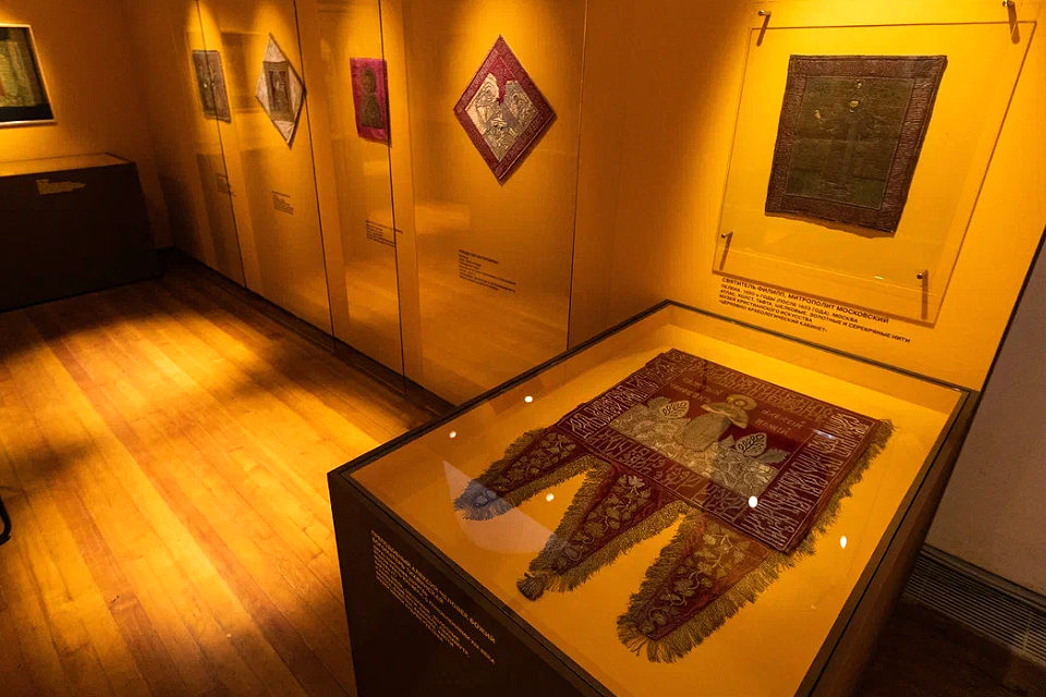 В экспозиции представлены: хоругвь «Богоматерь Тихвинская – Алексий человек Божий», палица «Воскресение Христово», созданная в XVI веке. Из необычных экспонатов — грузинская вышивка «Сошествие во ад». На черном фоне золотными нитями вышит сюжет, обрамленный цветами. Когда-то они были яркими и очень четко иллюстрировали контраст кромешного чистилища и райских садов. Отдельную витрину занимают вышивки бисером. Здесь можно увидеть и паломнический «сувенир» из Иерусалима — плащаницу «Успение Богородицы». Такие памятные образы создавали по мотивам большого полотна, а паломники развозили их с собой по всему христианскому миру.