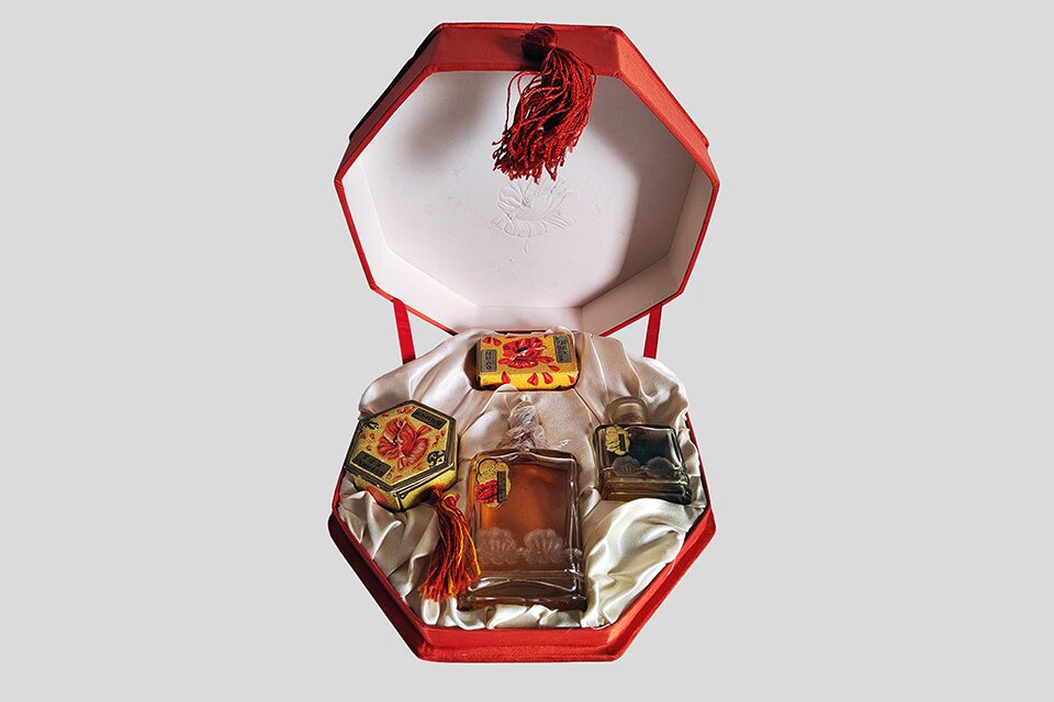 Вторая часть посвящена новому времени и советской эстетике: художественно исполненные упаковки к легендарным ароматам «Красная Москва», «Манон», «Красный мак», а также предметы быта и гардероба.