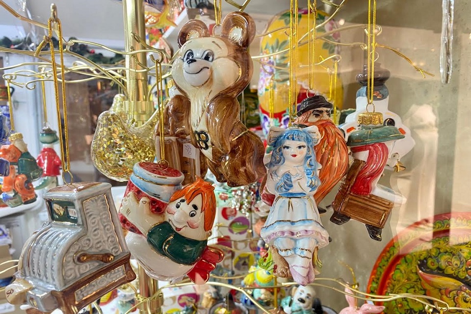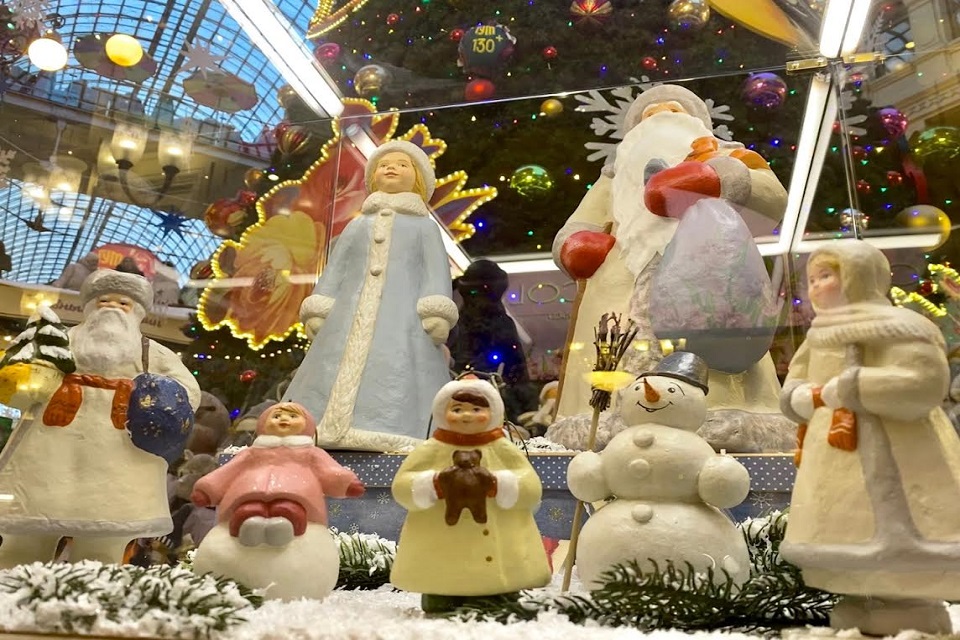 В центре ГУМа развернулась круговая «батарея» прилавков. Шарики от 500 рублей, фигурки поинтереснее — от 1000. Змей-Горыныч или Чебурашка, которые умещаются на детской ладошке, стоят 4200 рублей. Игрушки из ваты обойдутся посетителям: маленькие около 5500 тысяч, большие Дед Мороз со Снегуркой — по 12 600.