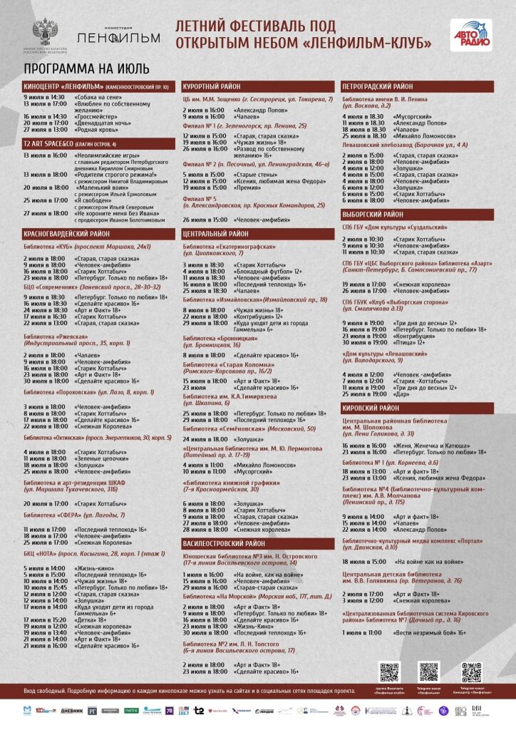 Вход на мероприятия фестиваля «Ленфильм-клуб», который пройдет с 1 июня по 31 августа 2025 года на разных площадках Санкт-Петербурга, свободный.