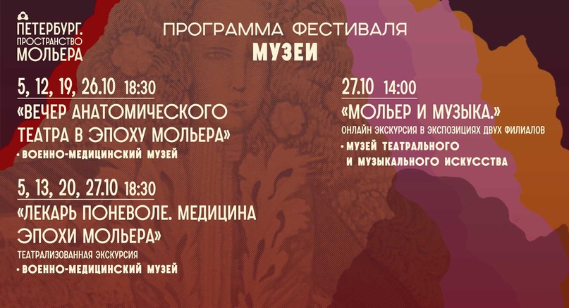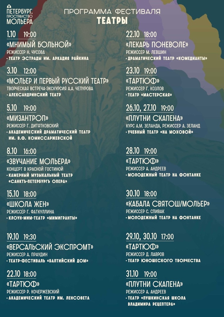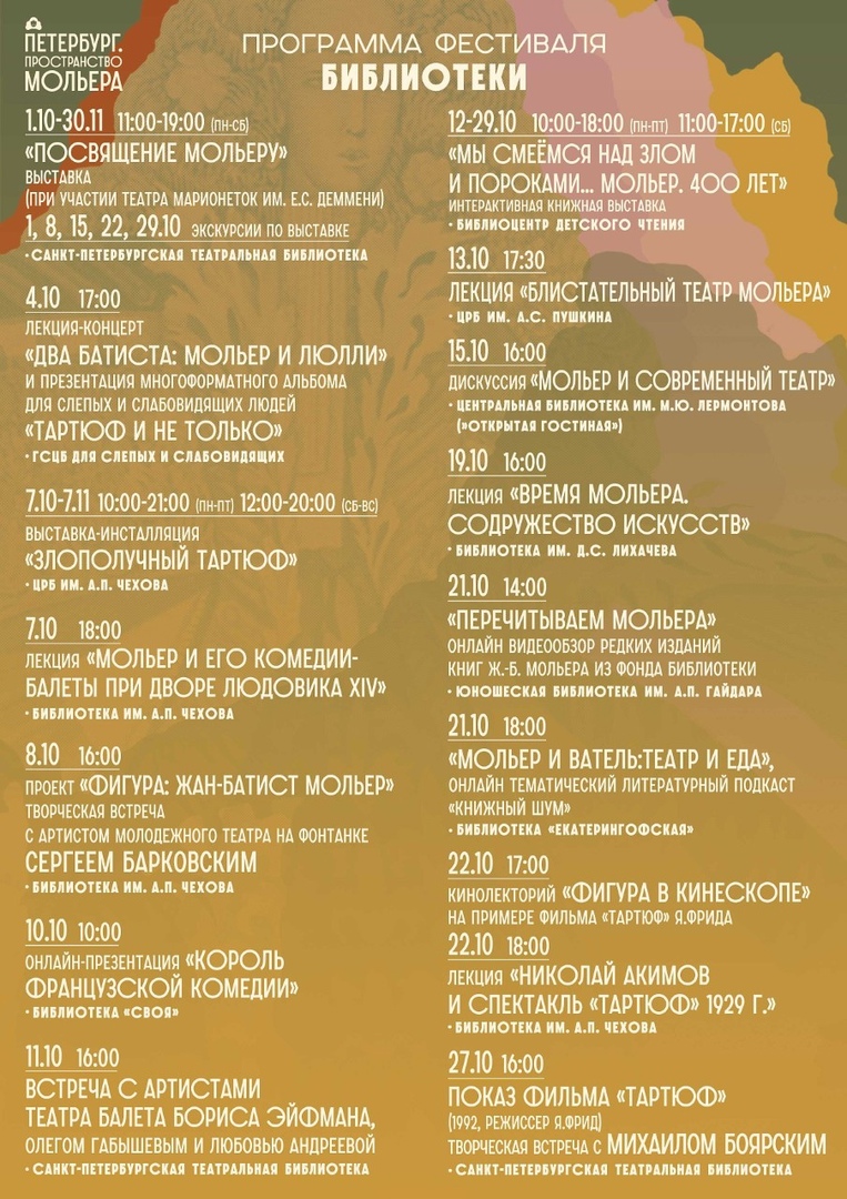С 1 по 31 октября 2022 года в Санкт-Петербурге пройдет Фестиваль «Петербург. Пространство Мольера». Меоприятия пройдут на разных городских площадках: в музеях, библиотеках и в театрах.