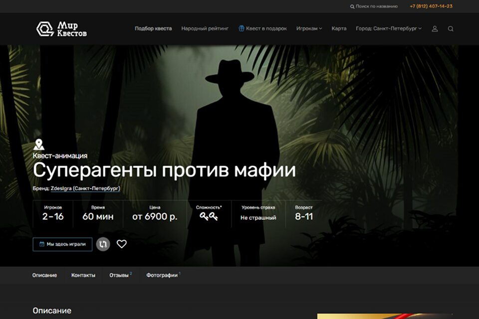 Отважным агентам нужно тайно внедриться в город, разузнать планы мафии, проявить недюжинные рассудительность и смекалку. Игроки получат все необходимое агентское оснащение. Опытные актеры и эффектные декорации обеспечат полное погружение в атмосферу шпионского боевика. Возраст: от 8 до 11 лет.