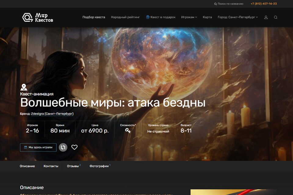 «Волшебные миры» объединяют увлекательный квест, полный хитроумных головоломок и мини-игр на логику, эрудицию и смекалку, с живой актерской игрой и отдыхом после прохождения в специально обустроенной чиллаут-зоне. Все участники игры облачатся в соответствующие атмосфере костюмы и непременно преодолеют все испытания. Игра рассчитана на аудиторию 8-12 лет.