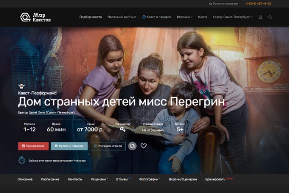 Квест буквально переносит участников во вселенную бестселлера «Дом странных детей». Увлекательное путешествие, загадки, головоломки и целых два двухэтажных дома, в которых происходит действие. Персонажи книги сойдут с ее страниц, чтобы непосредственно рассказать свои истории и поучаствовать в борьбе добра и зла.