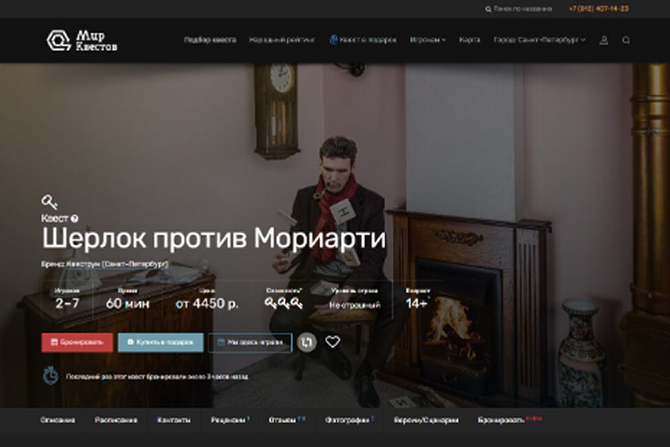 Классический детективный квест по мотивам популярного сериала с Бенедиктом Камбербэтчем. Сюжет начинается с невероятного происшествия — великого сыщика Шерлока Холмса обокрали. Он получает анонимное послание, в котором говорится, что все его имущество находится в одном из отелей Санкт-Петербурга. Зацепки ведут к тому, что дело не обошлось без давнего врага — профессора Мориарти. На решение задачи у команды есть всего один час.