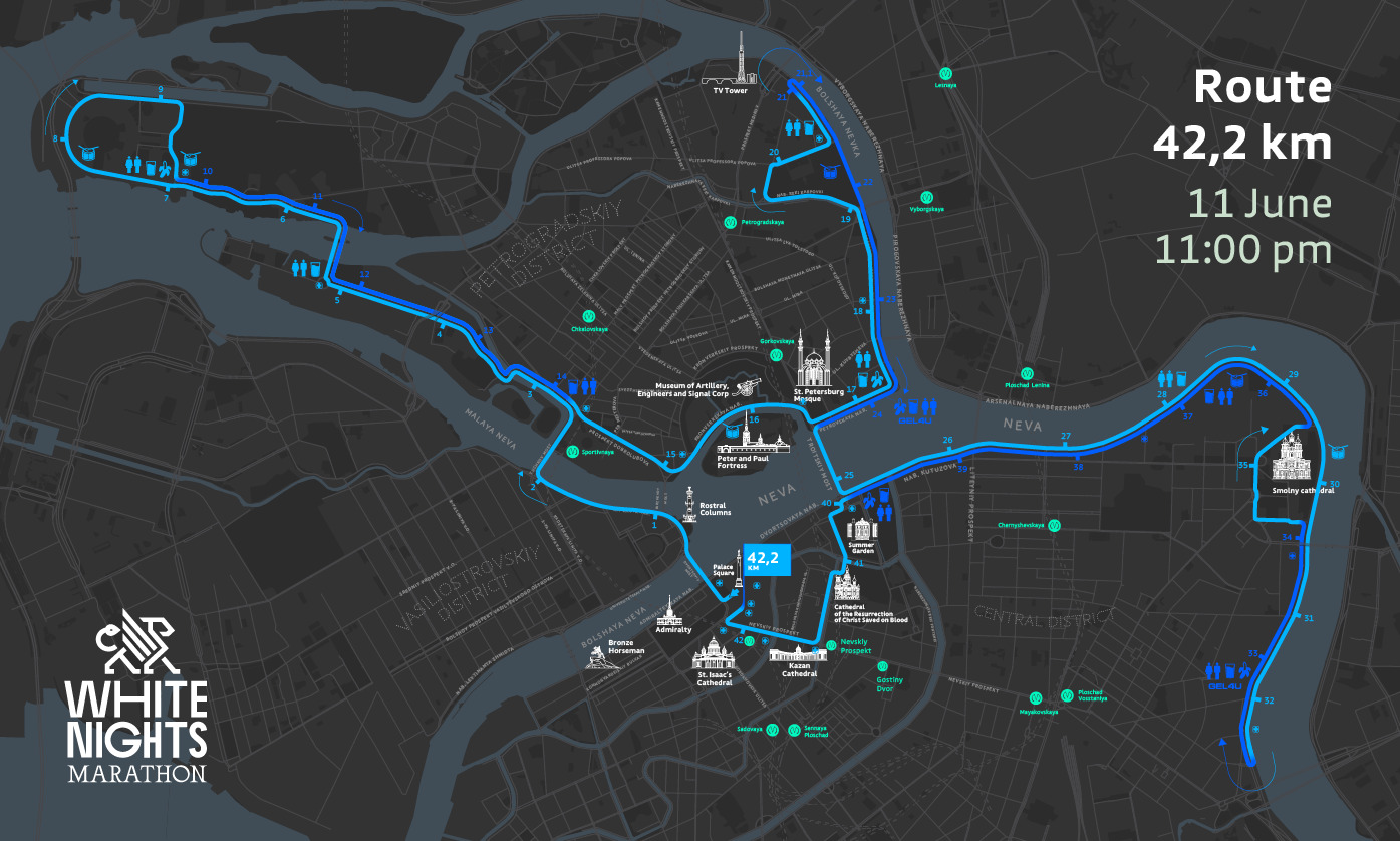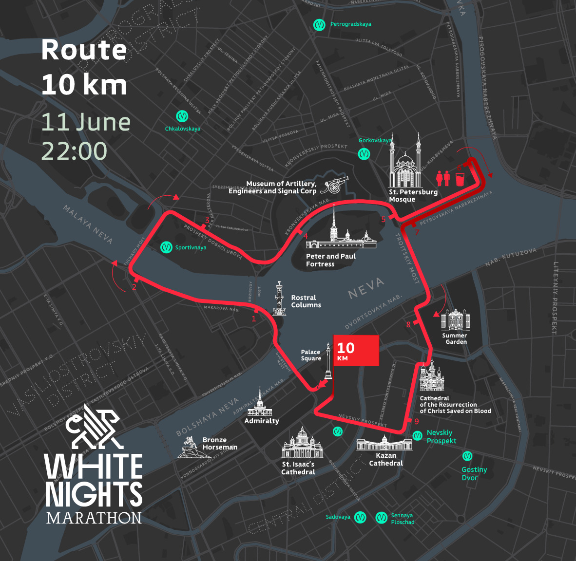 Открытие стартового городка, где расположены камеры хранения и раздевалки, в 20:00. Забег на 10 километров начется в 22:00, а на полную марафонскую дистанцию — в 23:00. Болельщики смогут пройти на площадь после 23:30.