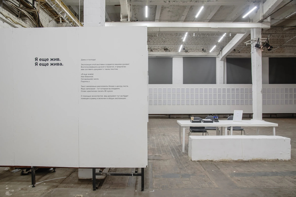 В разделе проекта «Я еще жив» Кузькин приглашает принять участие в перформансе. Посетители выставки могут написать на листе фразу «Я еще жив(а)» с фамилией и подписью. Ее оформят в рамку и сделают частью инсталляции.