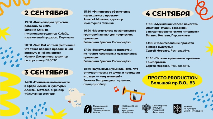 Также запланированы мастер-классы, лекции о кино и музыке, мастерские с артистами и продюсерами.