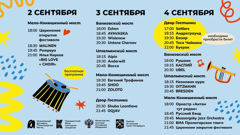 Фестиваль «Ленинградские мосты» каждый год проходит в Санкт-Петербурге. В этом году он выпал на 2, 3 и 4 сентября. По традиции основные концертные площадки — городские мосты: Банковский, Итальянский и Мало-Конюшенный. Добавилась новая площадка — двор Гостинки. В 2022-ом в течение трех дней выступят порядка 30 артистов и групп, среди них ZOLOTO, Тося Чайкина, ВИА «Пролетарское танго», Евгений Трофимов, АНДРЕГРАУНД, Буерак, Рушана, Базар и другие музыканты.
