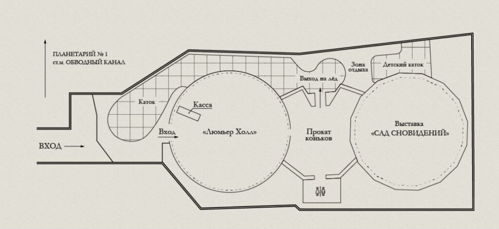 Площадь нового ледового пространства в двух шагах от Люмьер-Холла и Планетария 1 впечатляющая – полторы тысячи квадратных метров. Здесь проводили тематические катания в маскарадных костюмах, выступления музыкантов и ди-джеев, а также вечеринки. Ранее каток работал с середины декабря 2023 года до 10 марта 2024 года. В сезоне 2025-2026 каток на площадке работать не будет.