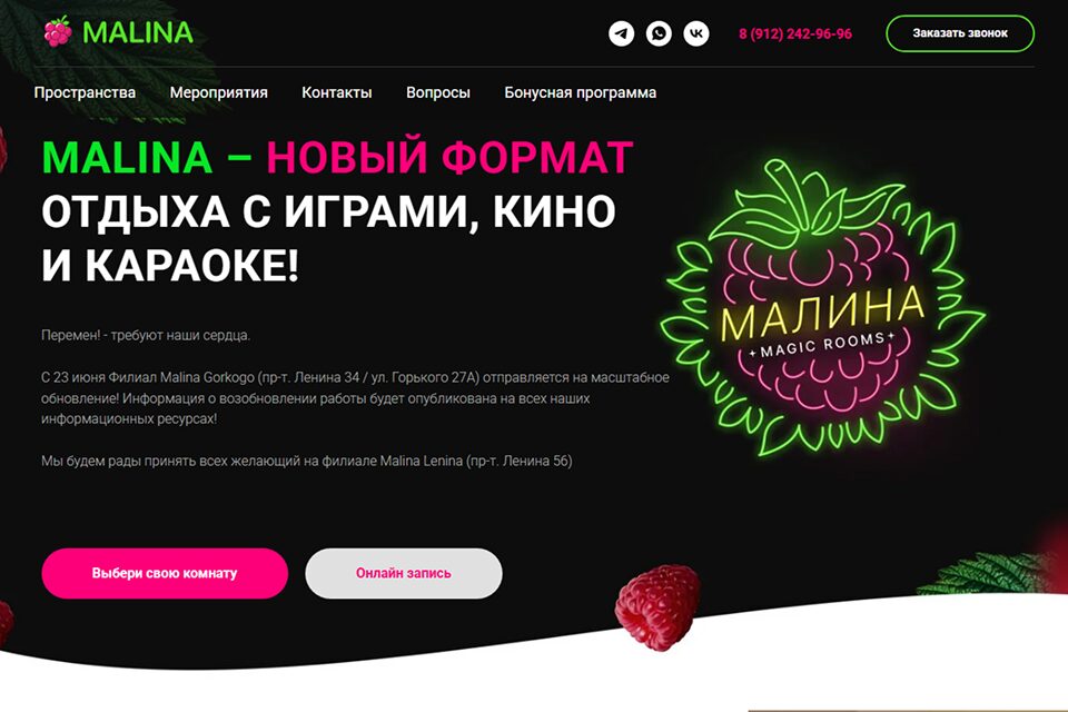 Malina Rooms — место для отдыха с играми, кино и караоке в центре города. Гостей здесь ждут авторские лимонады и газировки со всего мира, а также огромный выбор настолок и консолей (PS4, PS5, Xbox). Пространство отличается интересным дизайном – стильные тематические комнаты с уникальным оформлением подойдут для любой компании и праздника.