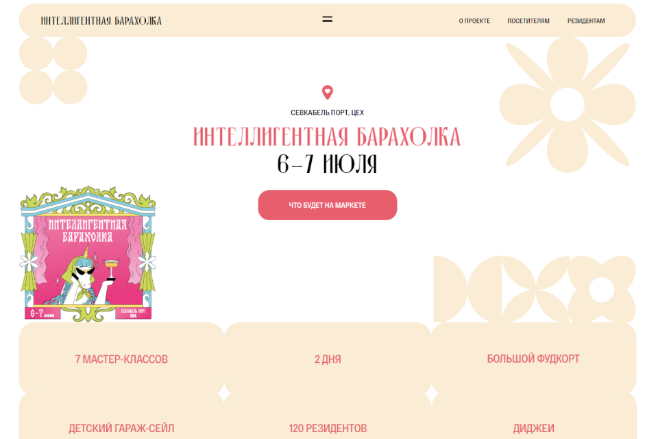 «Интеллигентная барахолка» за 10 лет существования стала одним из любимых событий петербуржцев и гостей Северной столицы. Событие проводится несколько раз в году и привлекает тысячи посетителей. Здесь можно найти винтажную одежду и постеры, деревянные и стеклянные игрушки, керамику ручной работы, натуральные украшения и сладости. Многие из этих товаров сделаны участниками своими руками. Обычно «Интеллигентная барахолка» делится на несколько зон. В одной продают одежду и оригинальные аксессуары, а в другой организуют фудкорт, где можно попробовать необычные угощения: от гречневого мороженого до пряного глинтвейна. Также проводятся мастер-классы по созданию аксессуаров, парфюма или ароматических свечей.