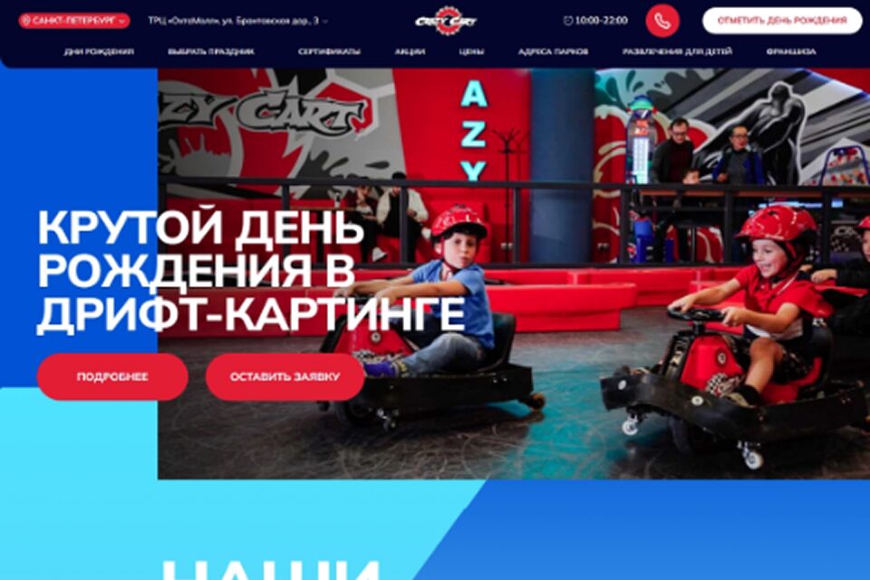 | Crazy Cart | Будни — от 600 до 1 700 рублей. Выходные — от 650 до 2 400 рублей. Праздничные тарифы Стандарт: будни на 5 детей — 12 990 рублей, дополнительные участники — по 1 500 рублей. Популярный: на 6 детей будни — 21 990 рублей, выходные 24 990 рублей. |