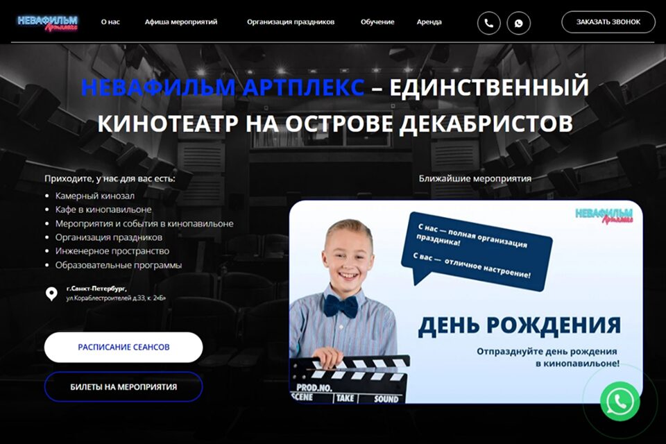 | «Невафильм Артплекс» | Стандартная цена — от 375 до 650 рублей. Просмотр кино с экспертом каждый четверг, кинозавтрак — каждый вторник. Организация праздников – от 21 000 рублей. |