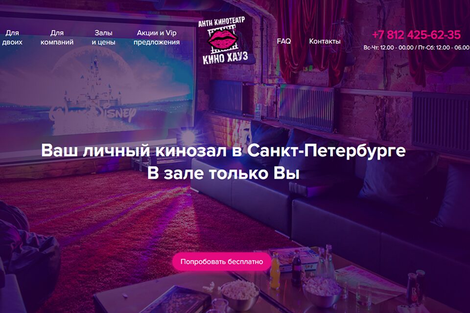 | «Кино Хауз» | Стандартная цена — от 800 до 2 200 рублей в час (за зал). VIP–свидания – от 3 500 рублей. Пакетные предложения на праздник от 3 часов – от 6 500 рублей. |