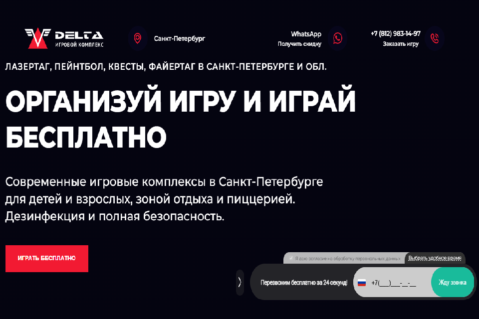 Delta Paintball – современный игровой комплекс с крытыми и открытыми площадками для лазертага, пейнтбола, квестов и фиртаг. Клуб предлагает просторные игровые зоны общей площадью от 1 000 до 6 300 квадратных метров, расположенные в разных районах города и области. Средни них площадки в районе Обводного Канала, Севкабель Порта, на Парнасе и в Токсово. Каждая территория оснащена современным оборудованием, а инвентарь постоянно дезинфицируется для безопасности посетителей.
