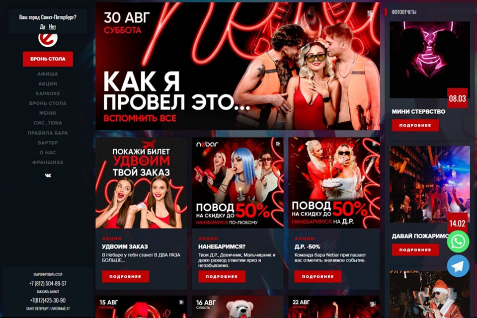 Мероприятия: В насыщенной афише найдется все от регулярных шоу–программ с участием танцевальных коллективов и приглашенных артистов до заводных вечеров в стиле «Назад в 90–е» и «Плейбой–Пати». Проводятся ретро–дискотеки, тематические вечеринки (Halloween, новогодние, костюмированные балы), а также VIP–вечера с живой музыкой. Караоке–зал работает в формате «Best Hit Night», когда гости исполняют хиты под живой аккомпанемент и с бэк–вокалом профессионалов. DJ–резидентами клуба становятся известные петербургские и приглашенные диджеи из других городов. Дополнительно проводят розыгрыши призов, конкурсы, акции для именинников и бонусы постоянным гостям. По флаеру возможен бесплатный вход, по праздникам действуют специальные условия и дополнительные скидки на барное меню.