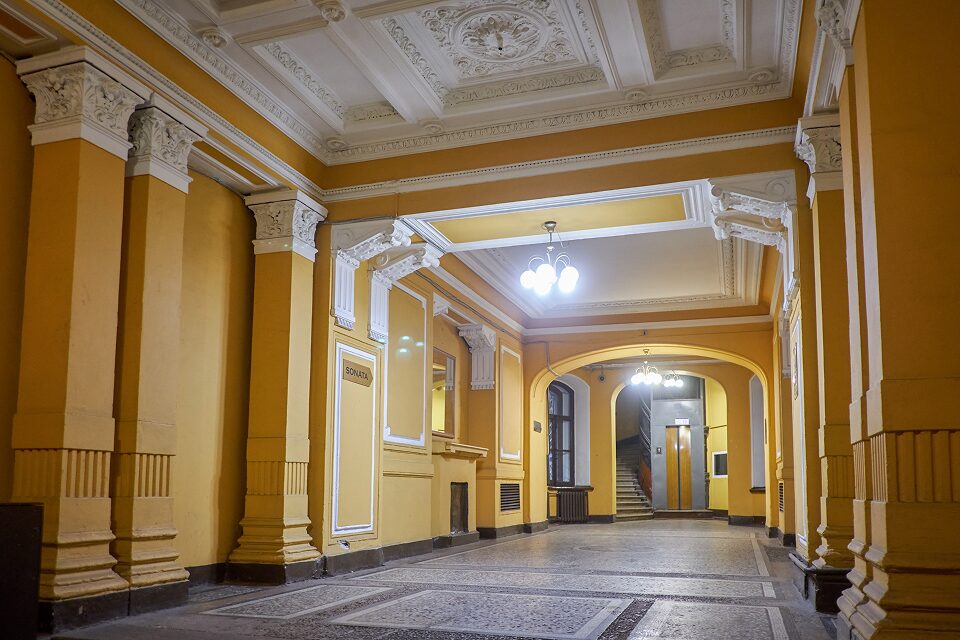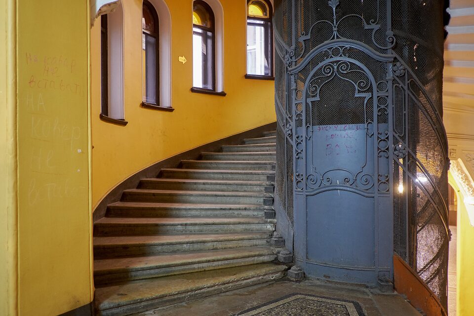 Ее называют «Ромашкой» – и стоит только войти, как сразу становится понятно, почему. Желтые стены, белая розетка купола, и вот уже кажется, что находишься внутри большого полевого цветка. Архитектор Гавриил Барановский построил этот дом в 1892 году для Григория Елисеева, среднего сына купца. Здание спроектировано как шедевр: винтовая лестница вокруг шахты лифта, заканчивающаяся куполом со сквозным остеклением – редкое инженерное решение для конца XIX века. В этой самой шахте когда-то стоял первый в Санкт-Петербурге паровой лифт. Лифта давно нет, но шахта осталась, как память о времени, когда город активно осваивал технологию. Двери в квартиры отлично сохранились, хоть и все разные – словно каждая семья оставила свою подпись.