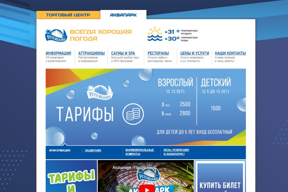 Самый большой аквапарк Санкт-Петербурга с пятью горками для взрослых, самая высокая из которых – 202 метра. Также есть волновой бассейн, джакузи, десяток бань и саун, «ленивая река» с течением и детская зона. Для именинников и пенсионеров работает система скидок.