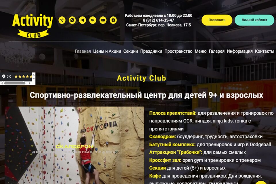 Activity Club — спортивно-развлекательный центр со скалодромом, где оборудованы боулдеринговые трассы и высокая стена с автоматической и верхней страховкой. Маршрутов в комплексе много, их регулярно обновляют под новичков и профессионалов спорта. Пространство специально рассчитано и на детей, и на взрослых, что позволяет посещать центр всей семьей.