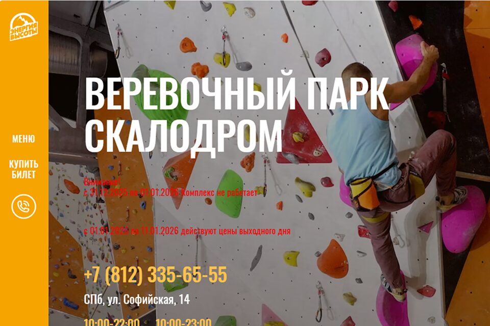 «Энергия высоты» – большой спортивно‑развлекательный комплекс с веревочным парком и скалодромом в Санкт‑Петербурге. Здесь можно посетить крытый веревочный парк с пятью уровнями и десятками трасс разной сложности, высотный скалодром до 17 метров с маршрутами на трудность, а также трассы эталонной скорости и большое боулдеринг‑пространство, активити‑зоны с батутами, троллеями.
