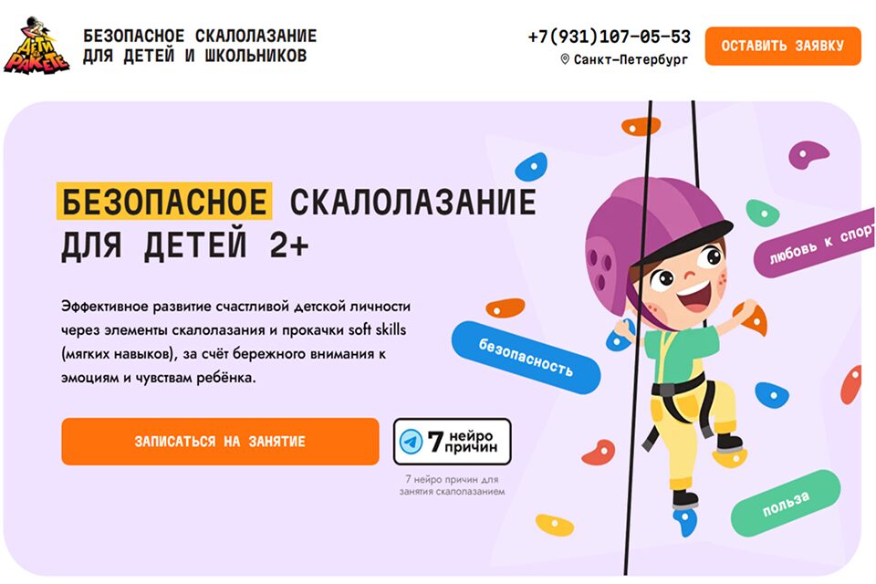 «Дети на Ракете» — скалодром и школа скалолазания в Санкт-Петербурге, где юные спортсмены могут познакомиться с новым видом спорта. Здесь установлены небольшие скалолазные стены с маршрутами, созданными с особым вниманием к безопасности. Все занятия проводятся на невысоких стенах с мягким покрытием и надежной страховкой, что делает их безопасными как для новичков, так и для тех, кто уже имеет некоторый опыт.