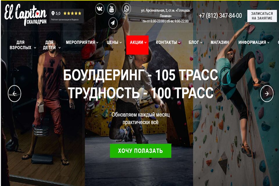 El Capitan по праву считается одним из самых масштабных. В его стенах регулярно проводятся тренировочные занятия для спортсменов всех возрастов, а также организуются различные мероприятия и состязания. Помимо скидок на первое посещение скалолазный комплекс предлагает подарочные сертификаты и абонементы на тренировки, что позволяет выгодно потренироваться и спланировать визит заранее.