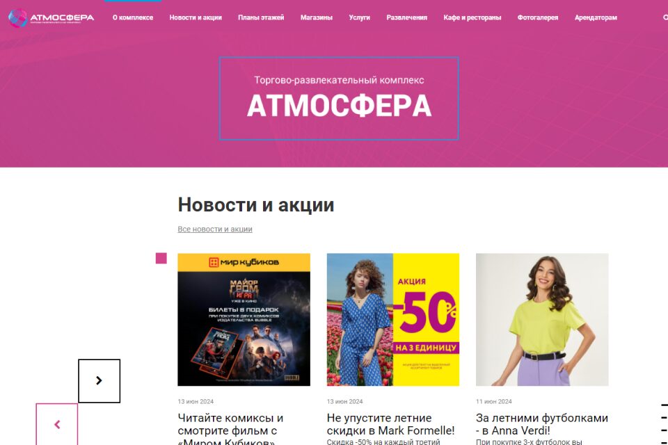 В торговом комплексе «Атмосфера» собраны ведущие торговые марки одежды и обуви, уютные кафе и рестораны, многозальный кинотеатр и целый этаж товаров для детей. Отдохнуть гости могут в 5D или в обычном кинотеатре, перекусить во «Вкусно и точка» или размеренно поужинать в «Охота на енота». «Атмосфера» больше подойдёт для целенаправленного шопинга, чем для встреч с друзьями и простой прогулки. Но это добавляет ему ещё один плюс: не такой обильный гостепоток, в отличие от мест, где есть много развлекательных мероприятий.